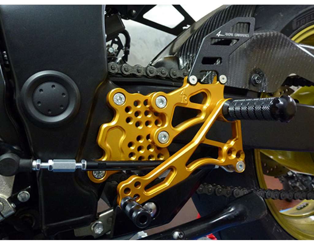 Pedana arretrata regolabile 4RACING 6 posizioni di regolazione sulla piastra. Arrettramento possibile cm 4 x 4. prodotto Made in Italy in alta qualita. Completamente ricavate dal pieno in alluminio 6082. Pedane estremamente robuste con piastre di fissaggio che consentono varie scelte per trovare la giusta posizione di guida. Le leve sono montate su 2 cuscinetti che garantiscono fluidita di movimento e assenza di giochi coassiali. I poggiapiedi di diametro e lunghezza adeguata assicurano un appoggio fermo e stabile anche grazie alla zigrinatura superficiale con ottimo grip. Le estremita sono fisse e arrotondate. La posizione dell' asta del cambio segue lo scheda originale. ATTENZIONE !! PER IL CAMBIO ROVESCIATO CON L AUSILIO DEL CAMBIO ELETTRONICO DI SERIE NON SONO SEMPRE COMPATIBILI RICHIEDETE INFORMAZIONI DEL SUO CAMBIO ORIGINALE. Configurazione cambio Stradale ( NO Rovesciato ). Viene fornito con la pedana Le pedane sono pronte per il montaggio all' interno troverete viti supporto marmitta per l attacco originale paratacchi e tutto quanto necessario all istallazione. Ricambi sempre disponibili. Sono disponibili a richiesta con un sovrapprezzo di 20 euro ed un attesa di 7 giorni lavorativi in piu i colori oro, rosso, blu, verde, titanio e bianco. Per maggiori informazioni contattateci.